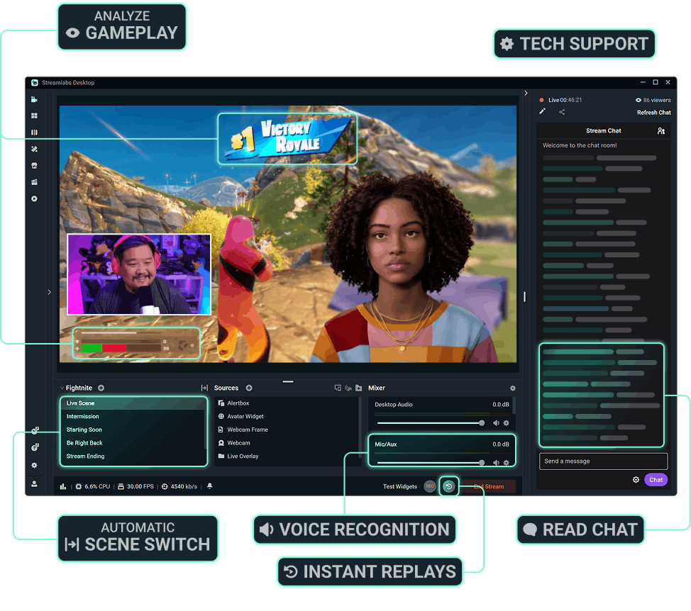Streamlabs AI powered features are here to make your stream production better than ever before. Automatically enhance your broadcast based on real-time, in-game events. Get the most of Streamlabs AI with Ultra.